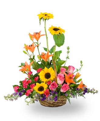 A Basket of Mixed Garden Flowers is an excellent choice for a funeral arrangement. This delightful basket includes a mix of colorful flowers, such as asters, Asiatic lilies, roses, sunflowers, larkspur, and mini carnations, all of which hold significant meanings, making the basket even more special for the recipient.